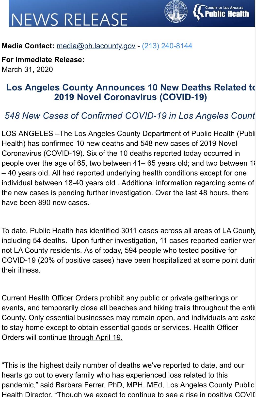 美国城市新闻网报道:洛杉矶郡政府官方发布,3月31日,洛杉矶郡公共卫生局宣布洛杉矶郡新增10个新型冠...