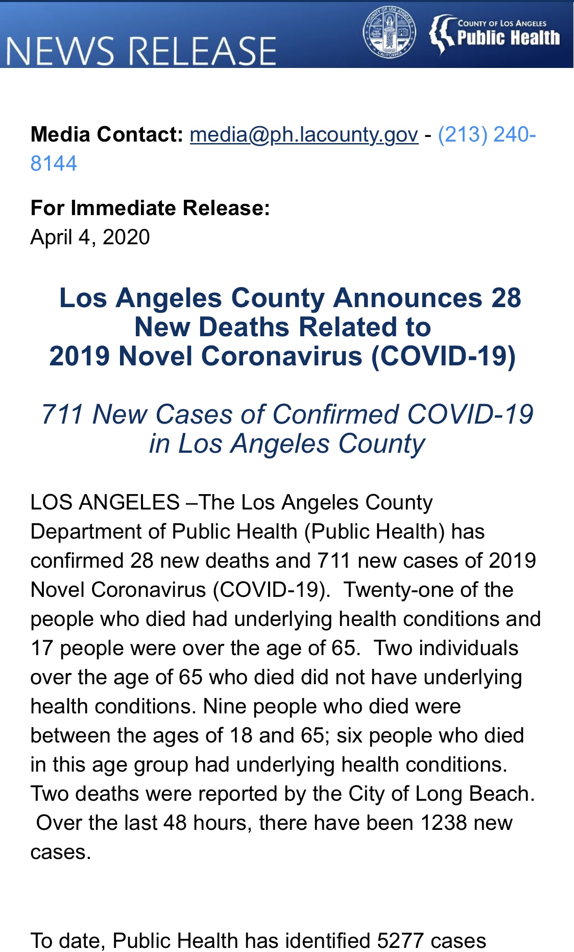美国城市新闻网报道:4月4日,洛杉矶郡公共卫生局刚刚发布,今天已确认新型冠状病毒有28个新增死亡病例...