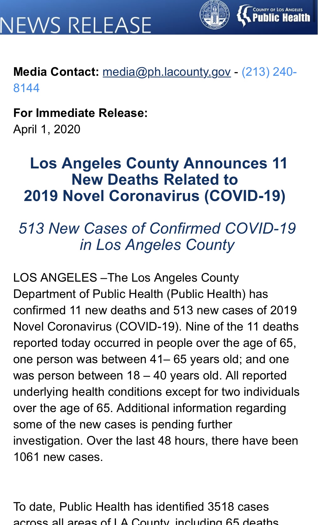 美国城市新闻网报道:洛杉矶郡公共卫生局(公共卫生)刚刚发布,今天已确认新型冠状病毒有11个新增死亡病...