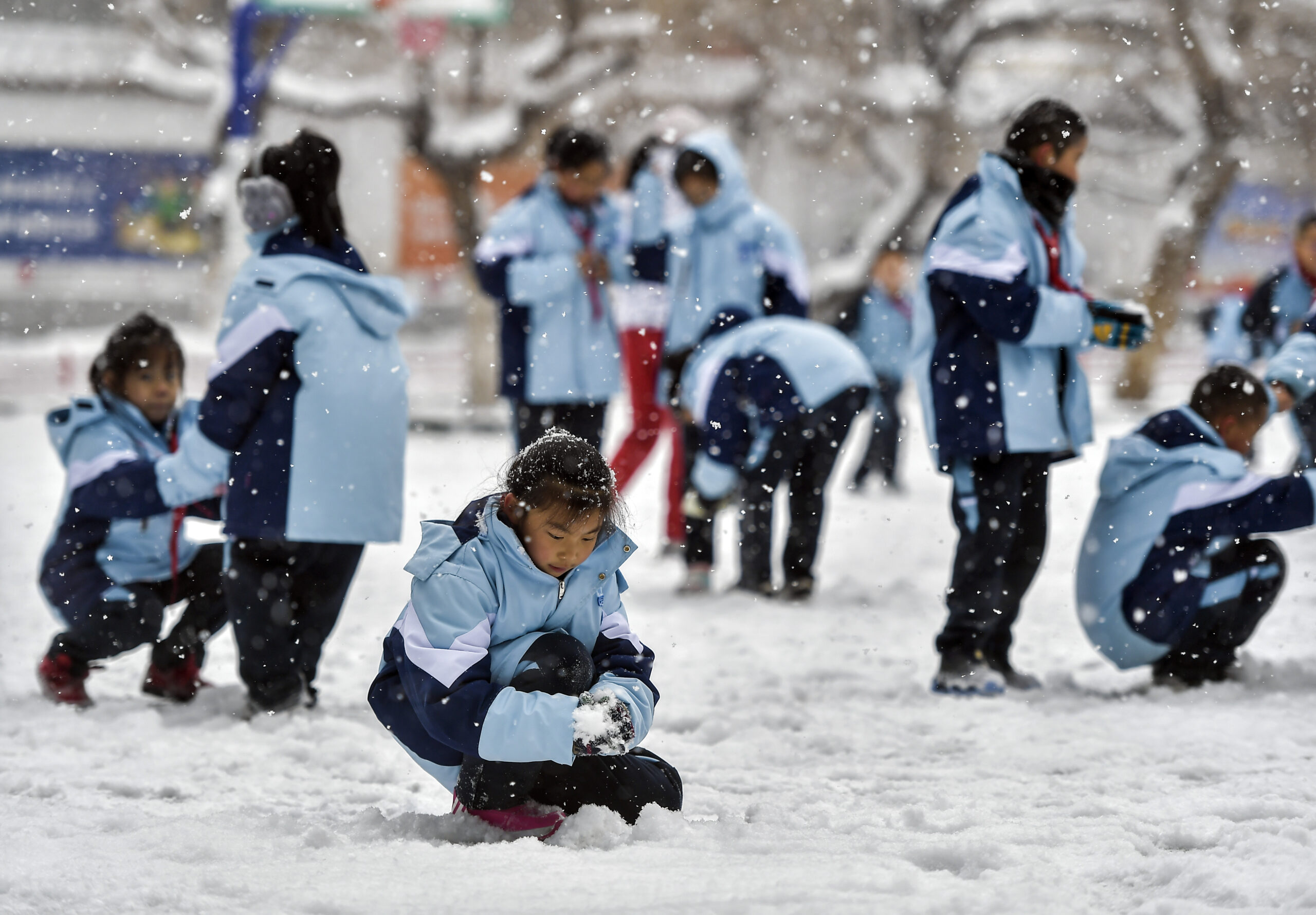 12月12日,乌鲁木齐市第十一小学的学生们在课间休息时玩雪。受冷空气影响,乌鲁木齐市出现持续降雪天气...