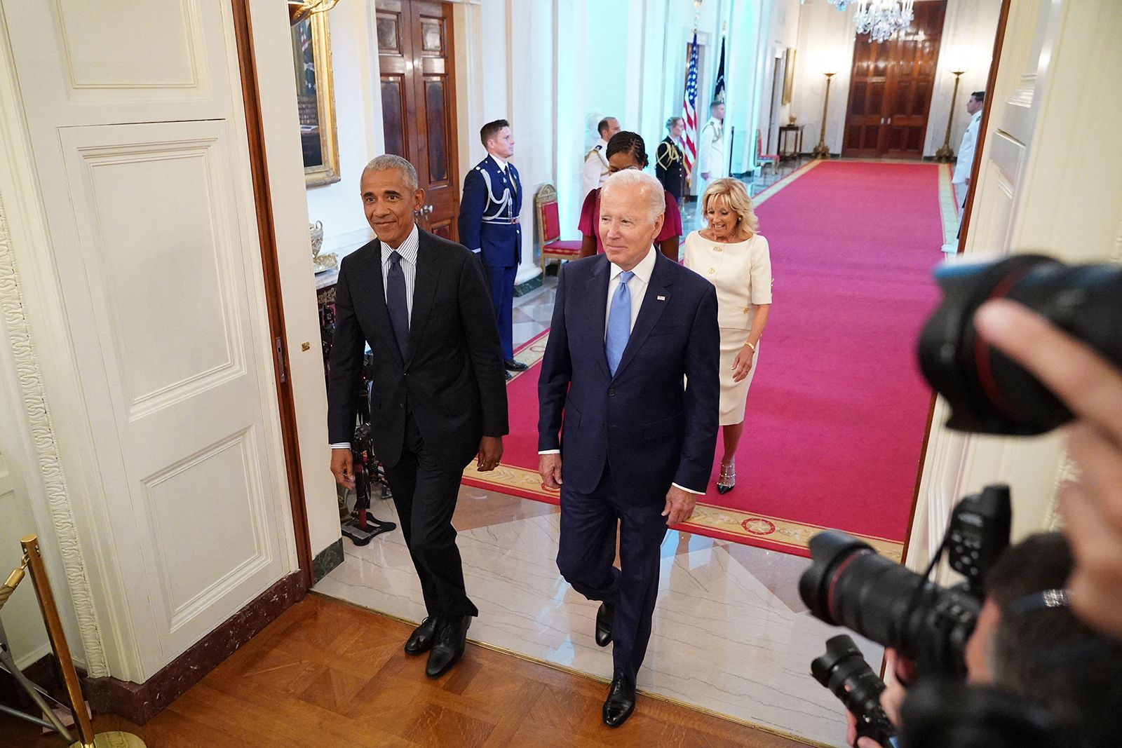 3月22日(周五),巴拉克·奥巴马(Barack Obama)与他的前副总统乔·拜登在白宫家庭餐厅相...