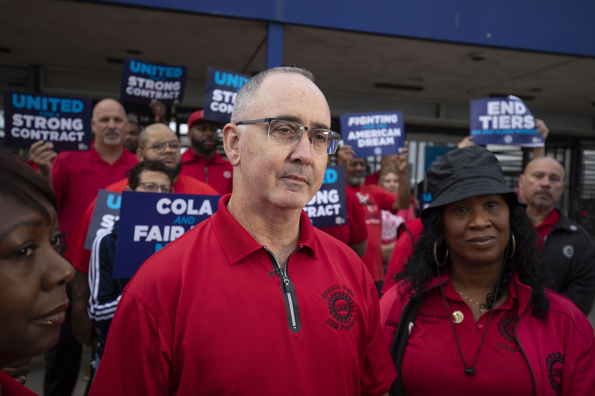 美国联合汽车工人工会(UAW)主席肖恩·费恩(Shawn Fain)在7月11日(周二)向工会成员发...