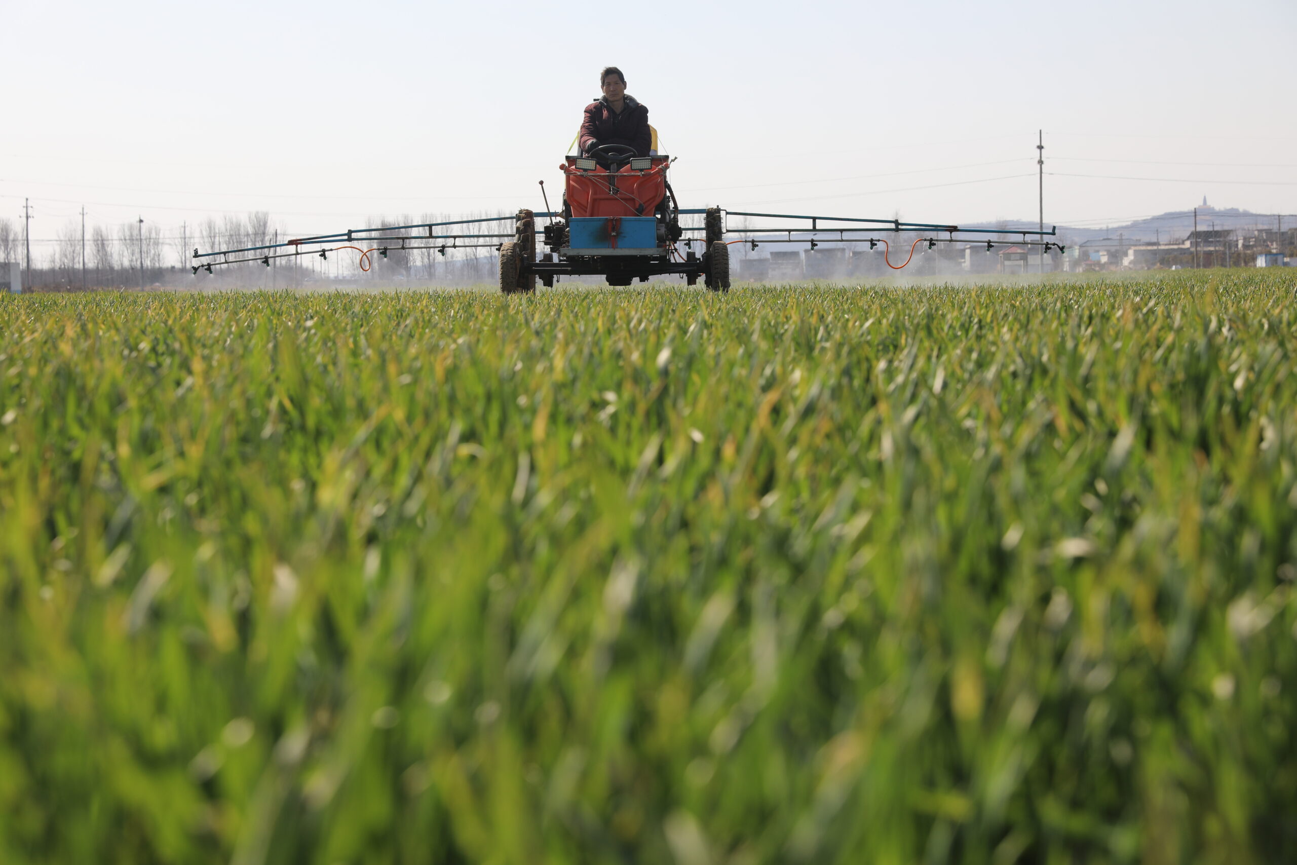 3月8日,河南平顶山宝丰县闹店镇,农户驾驶植保机在麦田内喷施农药。河南被誉为“中原粮仓”,随着天气转...