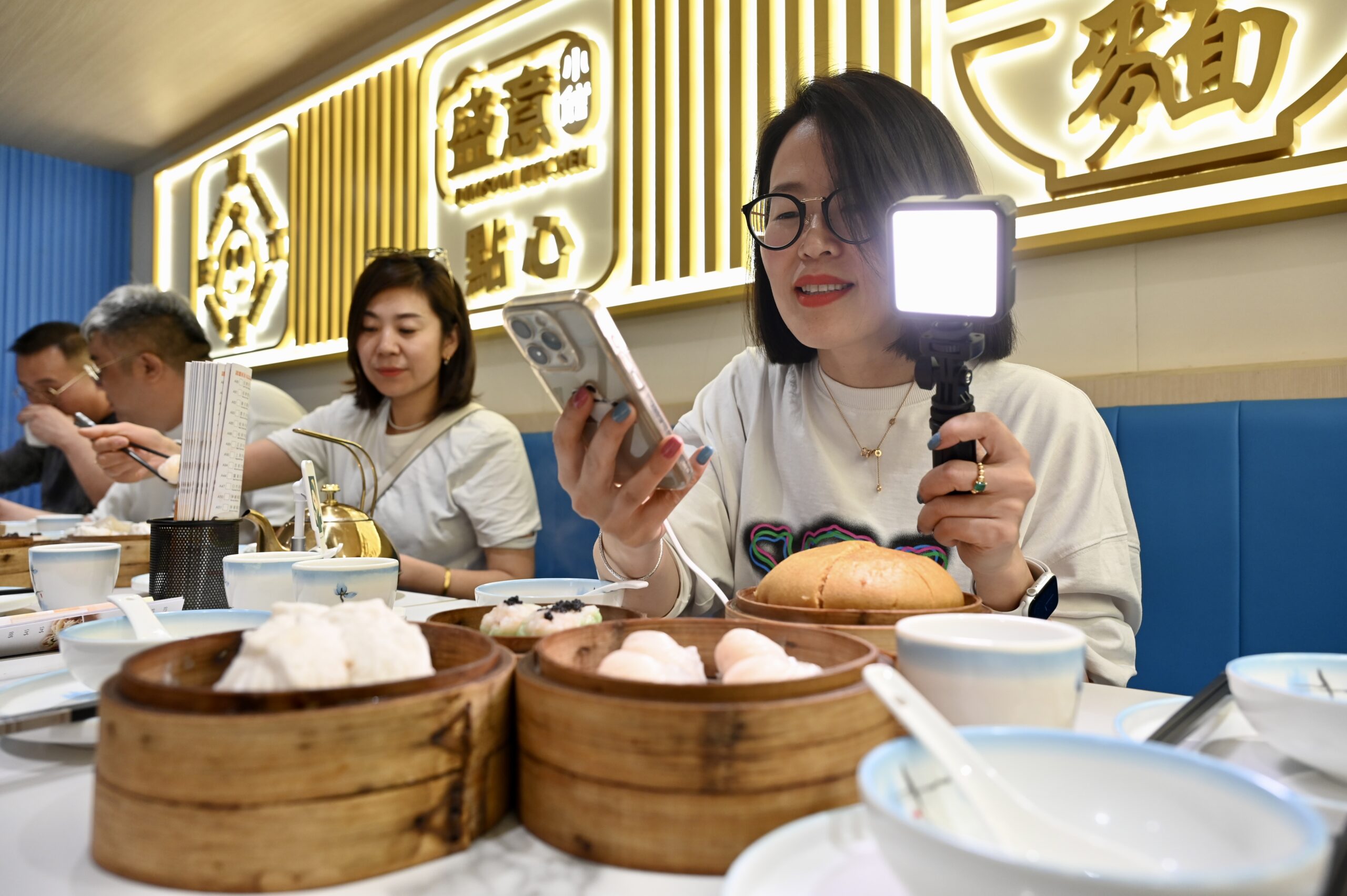 3月6日,西安、青岛开放港澳“个人游”首日,首批来自青岛的“个人游”旅客抵港马上品尝港式点心,夜游维...