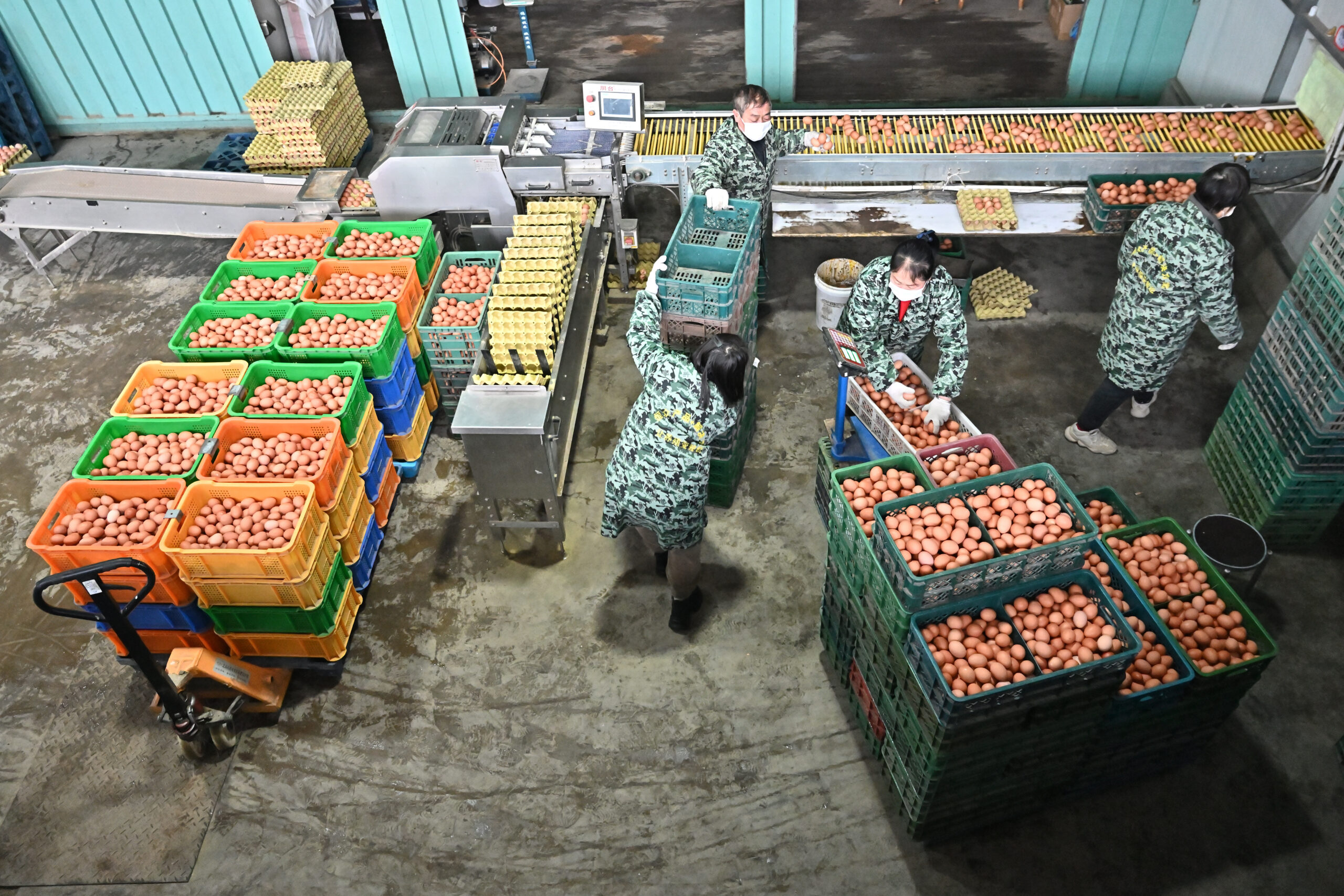 3月5日,山西省太原市杏花岭区,蛋鸡养殖场工人分拣打包鸡蛋。春节过后,太原市主要蛋鸡养殖场产能恢复,...