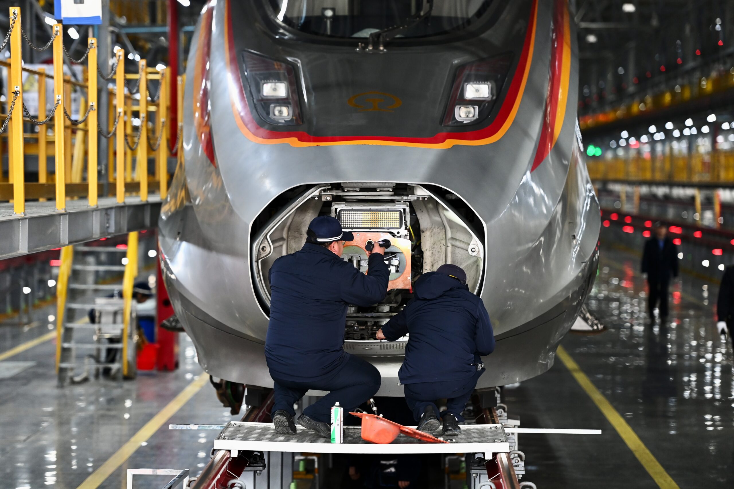 1月25日,机械师对列车自动车钩进行检查清洁。春运将至,福建福州南动车二所进入繁忙状态。动车组机械师...