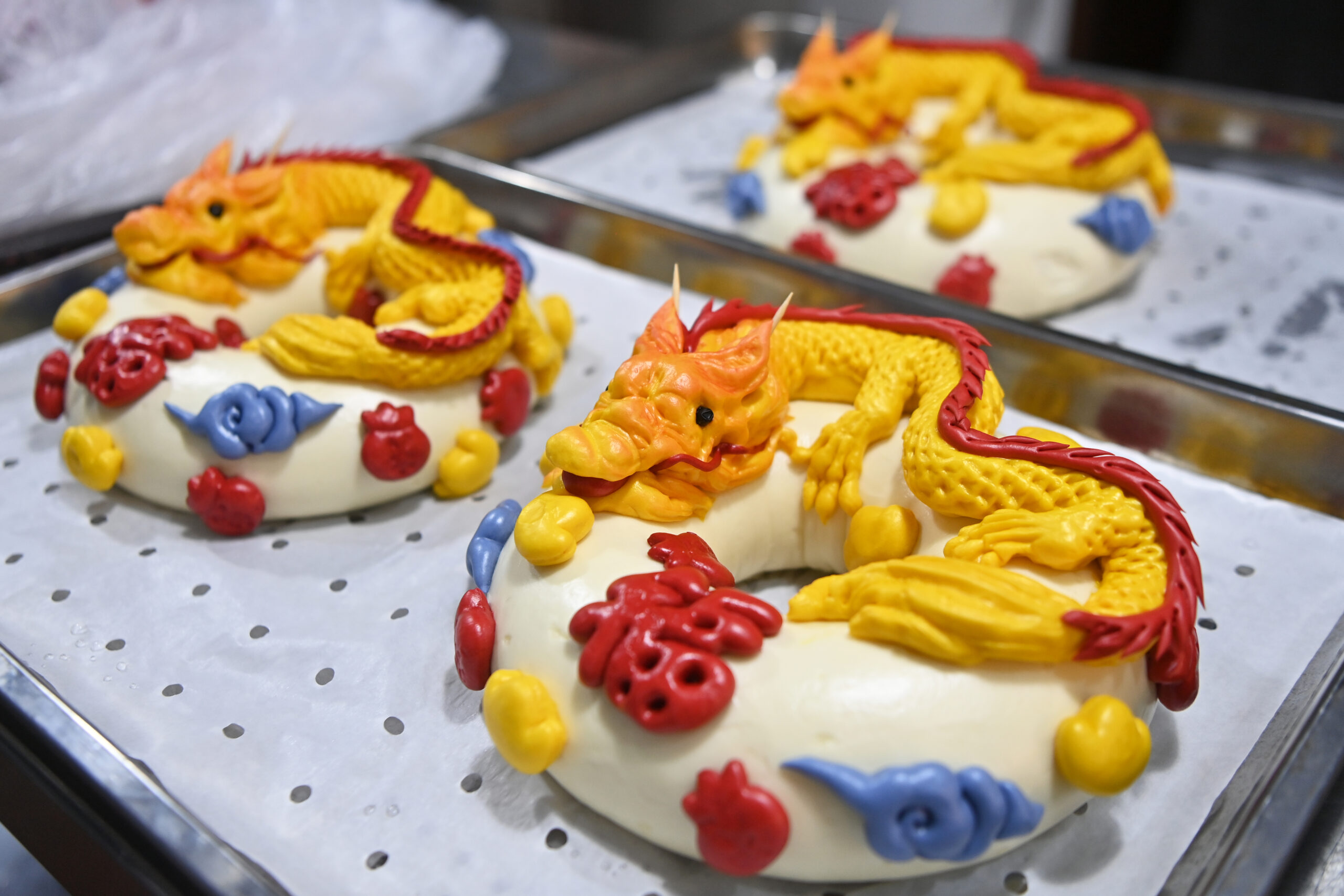 1月25日,在甘肃省兰州市七里河区一花馍店内,面点师设计蒸制出带有“龙”元素的花馍。据该店负责人介绍...