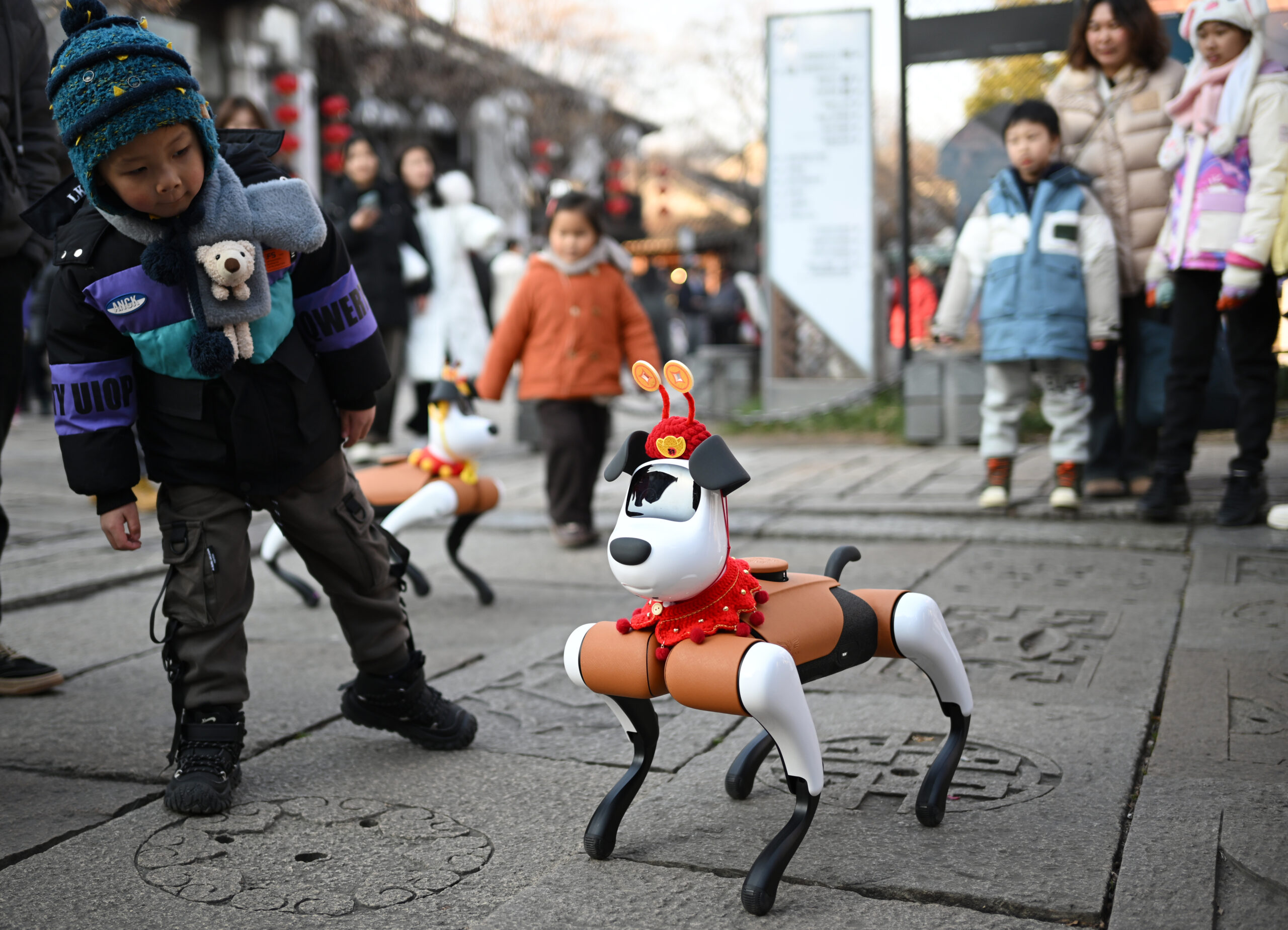 城市新闻网icitynews1月25日,江苏南京,两只打扮喜气洋洋的“机器狗”现身城南老街,吸引路人与其互动。 未经允许不得转载...