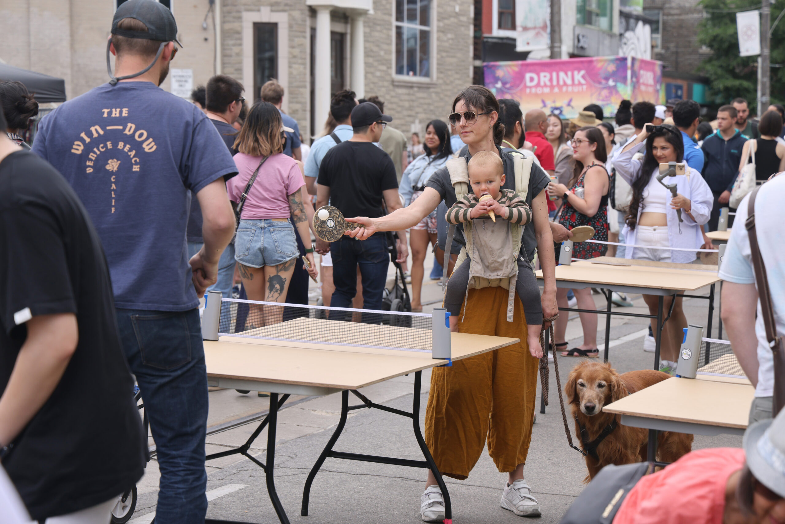 当地时间6月5日,加拿大多伦多,游人在“西区街市节”现场体验街头“迷你”乒乓球。这也是该项原本每年一...