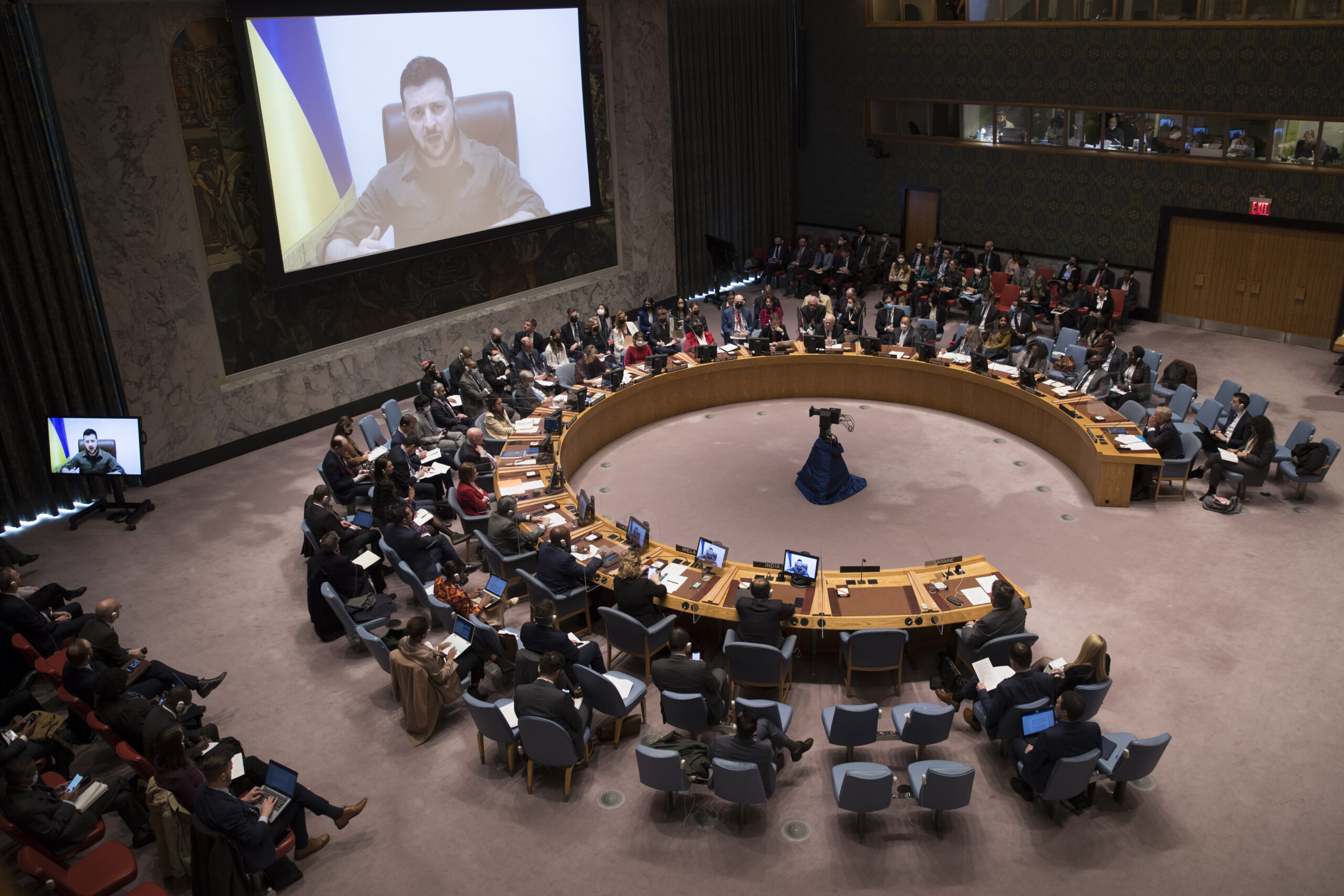 当地时间4月5日,联合国安理会在纽约联合国总部就乌克兰局势举行公开会。图为乌克兰总统泽连斯基通过视频...