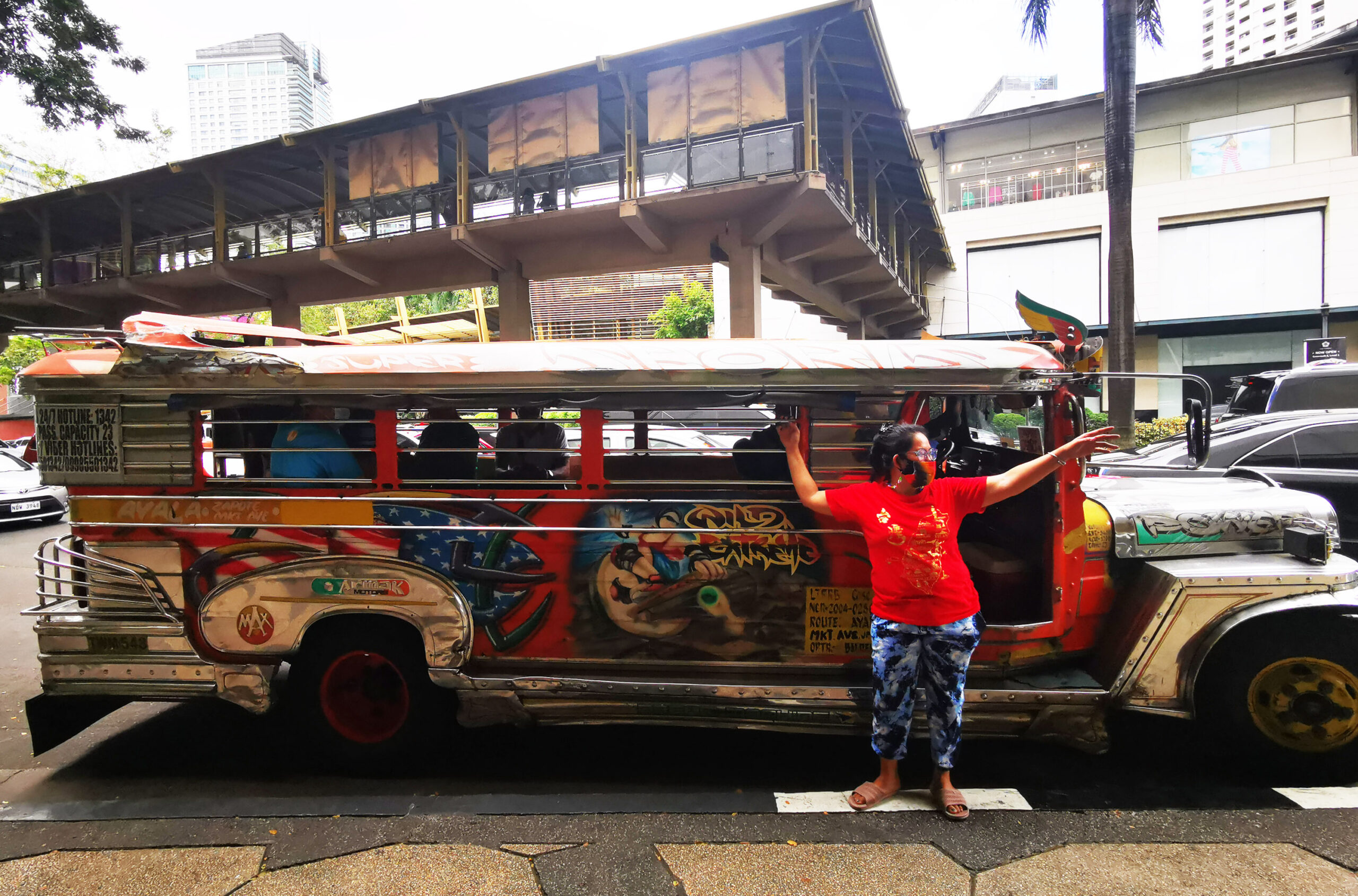 当地时间3月2日,马尼拉CBD马卡蒂绿带商圈车站,停着已拆除车内防疫隔断的公交吉普尼,售票员在招揽乘...