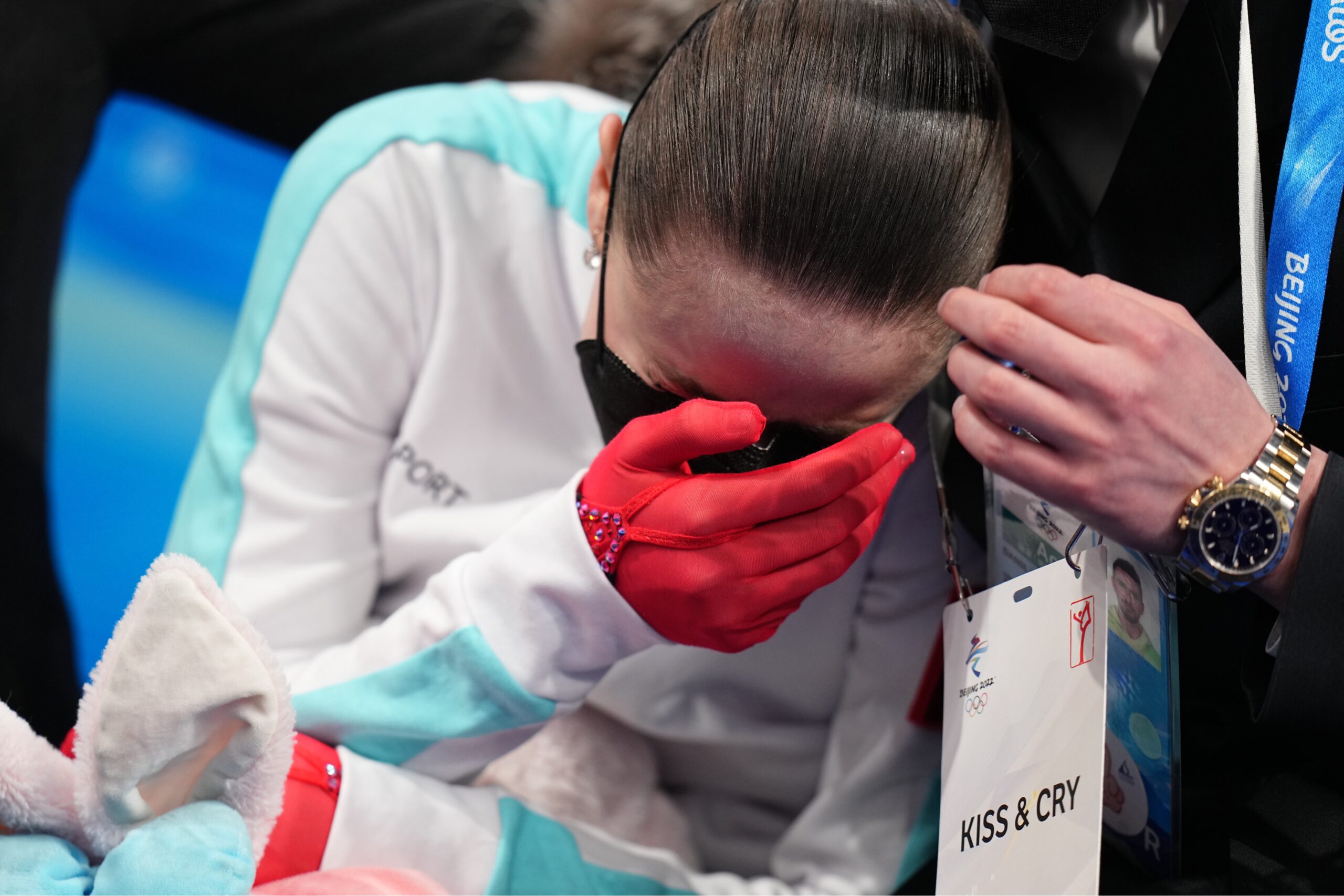 2月17日,俄罗斯奥委会选手卡米拉·瓦利耶娃在等待分数。 当日,北京2022年冬奥会花样滑冰女子单人...