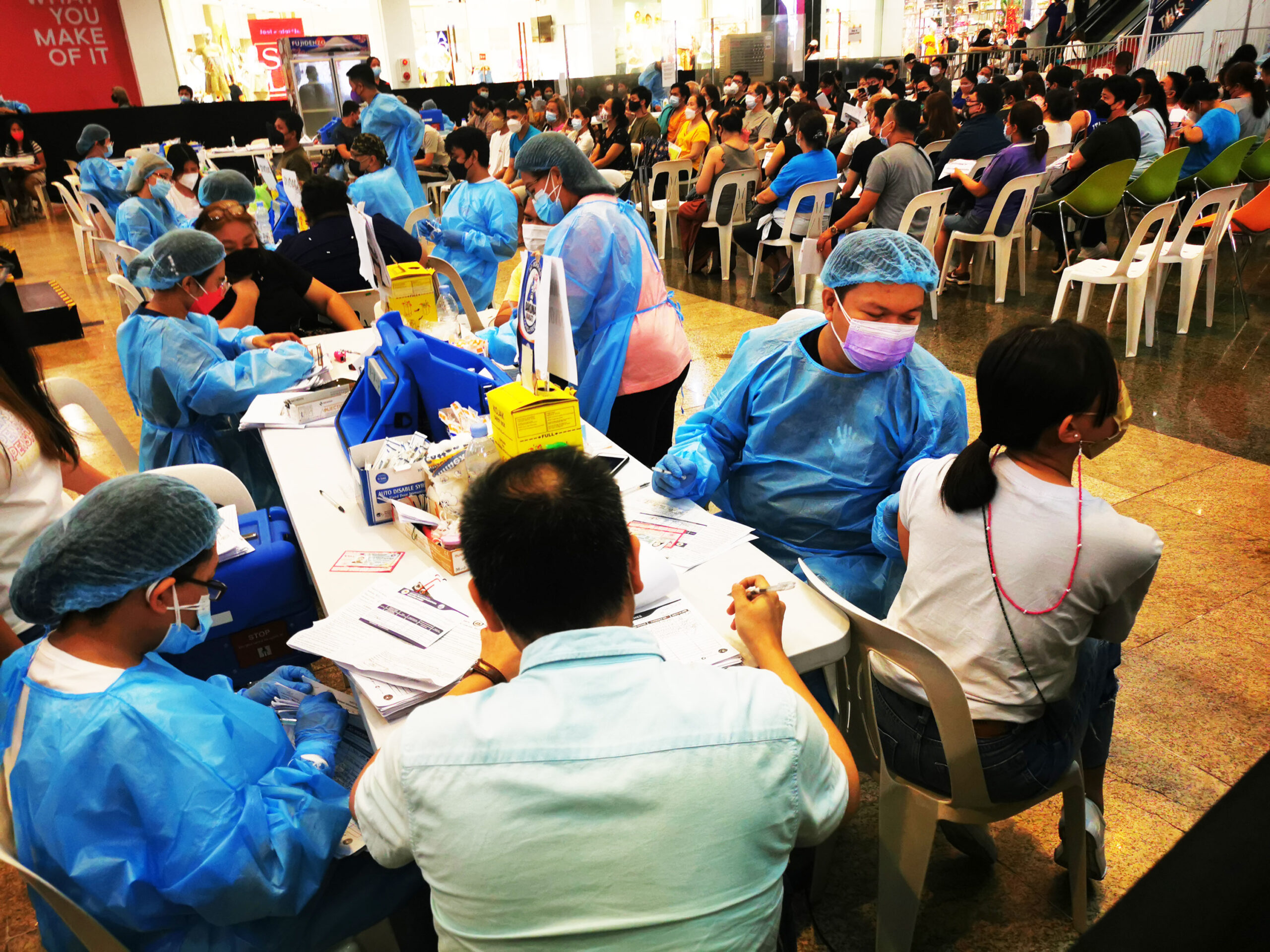 12月28日,菲律宾大马尼拉地区CBD马卡蒂一大型商场内,政府设立新冠疫苗加强针接种点,市民踊跃接种...