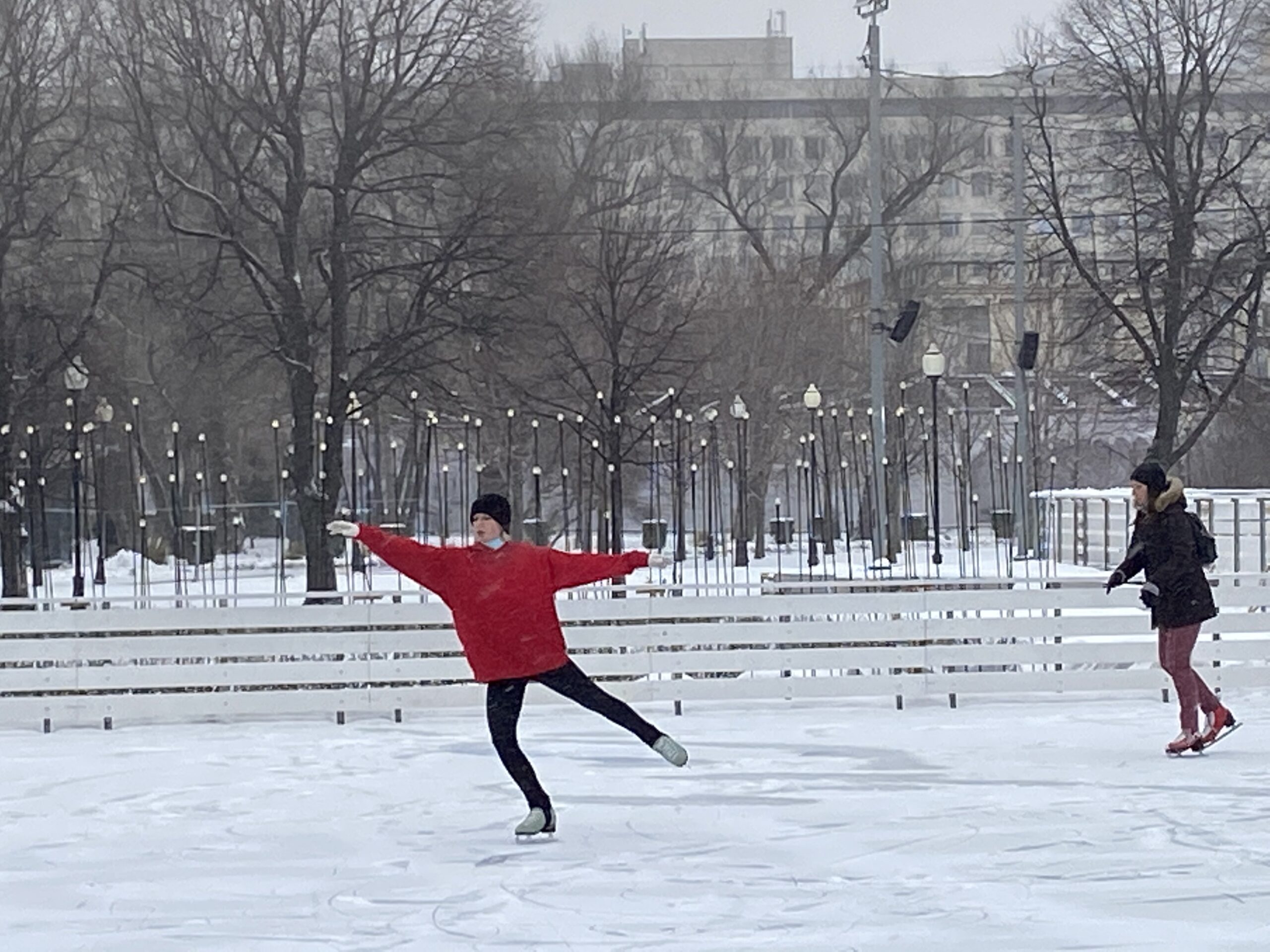12月1日,莫斯科普降瑞雪。图为莫斯科高尔基文化公园内滑冰场的滑冰爱好者。 未经允许不得转载:城市新...