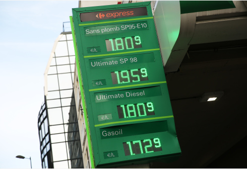 这是10月15日在法国巴黎一处加油站拍摄的油价显示牌。 法国总统马克龙14日表示,政府将在几天内出台...