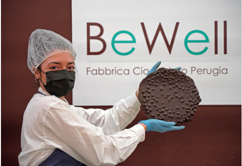 10月15日,一名女子在意大利佩鲁贾“欧洲巧克力节”上展示一块巧克力。 当日,第27届“欧洲巧克力节...