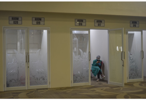 10月14日,在印度尼西亚巴厘岛机场内,一名卫生工作者在核酸检测室等候游客到来。 由于新冠疫情近期好...
