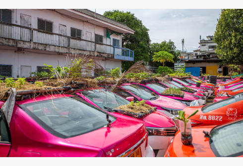 这是9月24日在泰国首都曼谷一个停车场拍摄的出租车“菜园”。 在泰国首都曼谷市郊的一个停车场,上百辆...