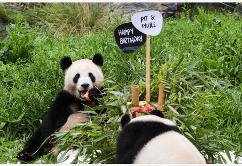 8月31日,在德国柏林动物园,大熊猫双胞胎的母亲“梦梦”(左)与大熊猫幼崽“梦圆”一起享用“生日蛋糕...