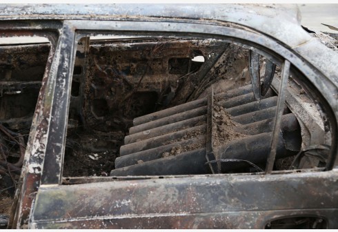 这是8月30日在阿富汗喀布尔拍摄的一辆毁坏的汽车,这辆汽车内部装有火箭弹发射装置,当日发射火箭弹后被...