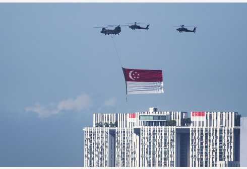 8月9日,悬挂新加坡国旗的直升机在新加坡参加国庆庆典检阅礼。 新加坡9日举行国庆庆典检阅礼,庆祝独立...