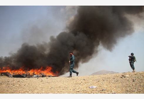 8月11日,在阿富汗楠格哈尔省,当地安全人员从被焚毁的毒品旁走过。 当日,阿富汗楠格哈尔省焚毁超13...