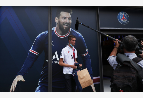 8月11日,在法国巴黎圣日耳曼俱乐部的主场——王子公园球场外,一名刚刚购买到梅西30号球衣的球迷接受...