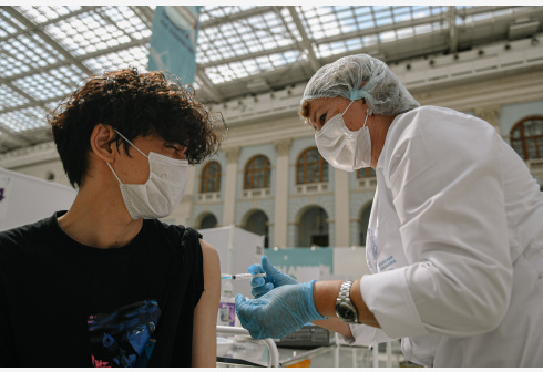 8月4日,在俄罗斯首都莫斯科红场附近的一个新冠疫苗接种中心,医务人员为一名男子接种疫苗。 该新冠疫苗...