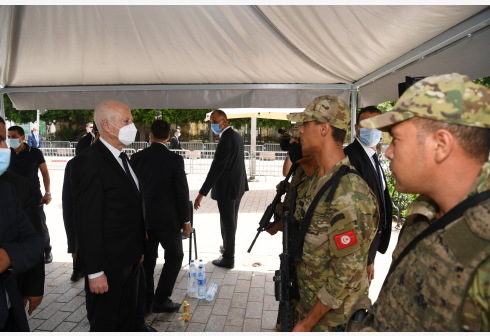 8月1日,突尼斯总统赛义德在首都突尼斯市中心与街头维护治安的士兵交谈。 突尼斯主要城市7月25日发生...