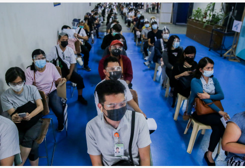 7月27日,在菲律宾圣胡安,人们排队等待接种新冠疫苗。 菲律宾卫生部27日报告,该国新增新冠确诊病例...