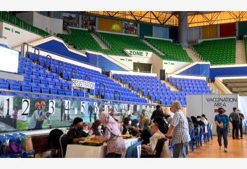 7月5日,人们在文莱斯里巴加湾市一处疫苗接种中心登记。 文莱政府5日正式启动新冠疫苗第三阶段接种安排...