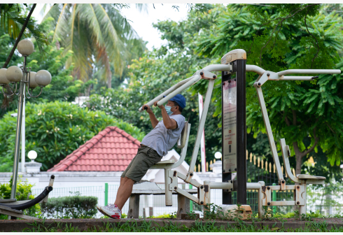 7月5日,一名市民在老挝万象一处公园内戴着口罩锻炼。 鉴于新冠疫情从邻国输入的风险升高,老挝政府4日...