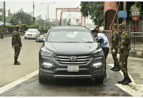7月1日,军人在孟加拉国达卡的街道上检查过往车辆。 为遏制新冠变异病毒德尔塔毒株蔓延,孟加拉国定于7...