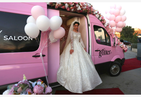 6月28日,在约旦河西岸城市纳布卢斯,一名巴勒斯坦新娘走出移动美容美发车。 两名女理发师亚丝明·贾比...