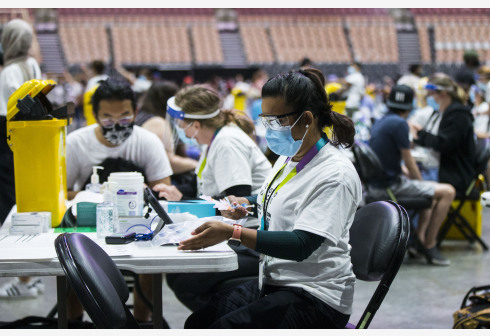 6月27日,在加拿大多伦多,疫苗接种员在大型新冠疫苗接种中心工作。 当日,多伦多举办新冠疫苗接种日活...