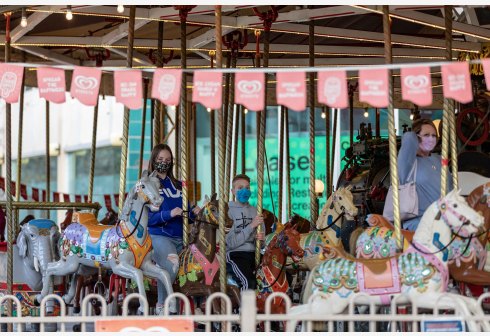 6月28日,人们戴口罩在澳大利亚堪培拉乘坐旋转木马。 为遏制新冠变异病毒德尔塔毒株进一步蔓延,澳大利...