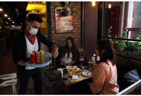 6月1日,服务员在土耳其安卡拉的一家餐厅为顾客提供服务。 土耳其决定从6月1日起进一步放松疫情管控措...