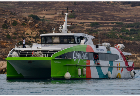 6月1日,从马耳他瓦莱塔驶出的一艘快速渡轮抵达戈佐岛的姆贾尔港口。 马耳他6月1日正式重启旅游业,往...