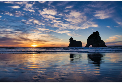 这是5月23日拍摄的日落时分的新西兰黄金湾华拉里基海滩,此地的两块岛礁被当地人称为“拱门岛”。 黄金...
