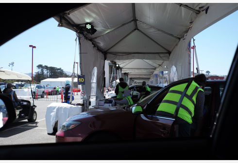 5月22日,在美国加利福尼亚州旧金山城市学院的新冠疫苗接种点,市民通过“得来速”的方式不下车接种疫苗...