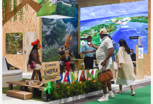5月20日, 在西班牙首都马德里举行的2021马德里国际旅游展上,工作人员在巴拿马展台工作。 马德里...