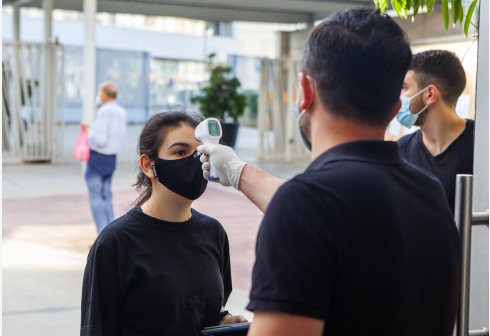 5月21日,在塞浦路斯首都尼科西亚,戴口罩的学生进入考场前接受体温检测。 塞浦路斯的“高考”——公立...