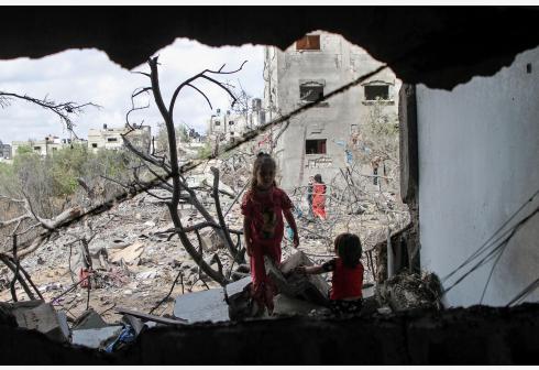 5月21日,巴勒斯坦儿童在加沙地带北部的贝特拉西亚查看遭以军空袭损毁的自家房屋。 巴勒斯坦伊斯兰抵抗...