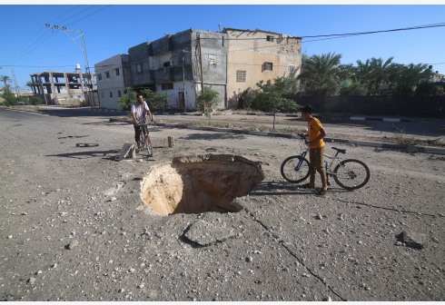 5月19日,巴勒斯坦人在加沙地带的拉法查看空袭在街道上留下的坑。 联合国负责政治和维和事务的副秘书长...