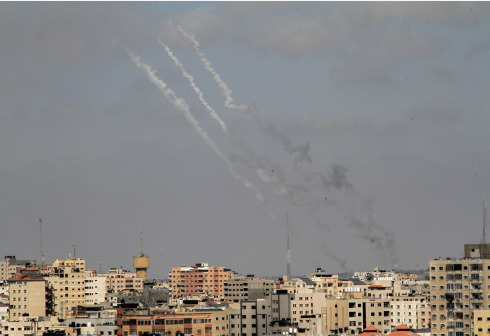 这是5月20日拍摄的从加沙地带北部向以色列境内发射的火箭弹冒出的浓烟。 连日来,巴勒斯坦加沙地带武装...
