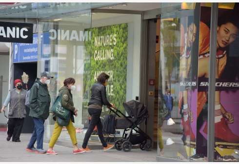 5月3日,奥地利维也纳市民在玛利亚希尔夫大街上准备进入商店购物。 3日起,奥地利首都维也纳恢复零售与...