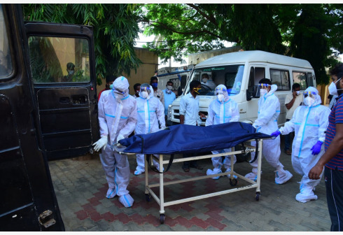 5月3日,印度医务人员在卡纳塔克邦转运新冠死亡患者的遗体。 印度卫生部5月3日公布的数据显示,该国较...