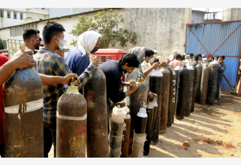 4月27日,人们在印度巴特那等待为氧气罐充氧。 近期,印度新冠疫情急剧恶化。印度卫生部27日公布的数...