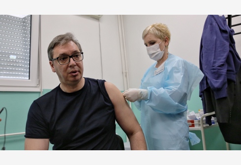 当地时间4月27日中午,塞尔维亚总统武契奇在塞南部多列瓦茨市普科瓦茨村卫生防疫站接种了第二剂中国国药...