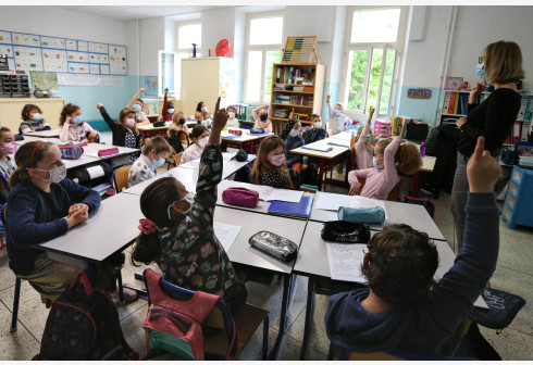 4月26日,在法国南部昂蒂布的一所小学,孩子们在学校上课。 当日起,法国小学和幼儿园开学复课。 未经...